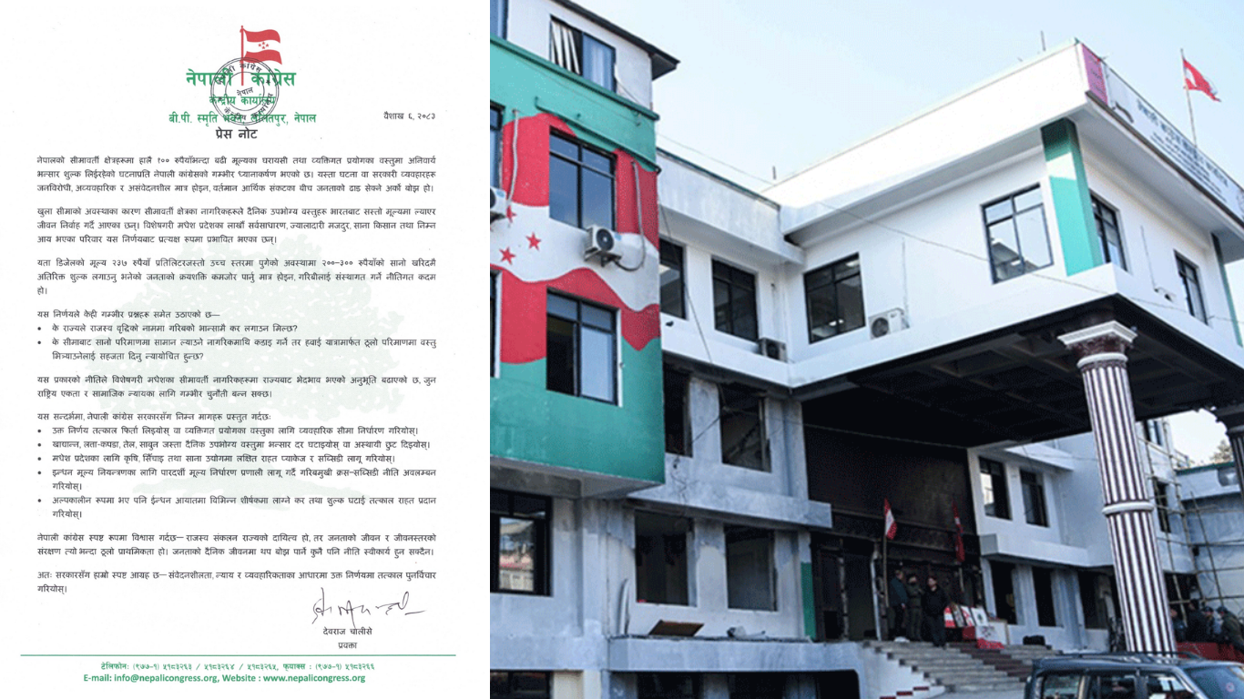 जनकपुरधाम — नेपाली कांग्रेसले सीमावर्ती क्षेत्रमा दैनिक उपभोगका वस्तुमा अनिवार्य भन्सार शुल्क लगाउने सरकारी निर्णयप्रति आपत्ति जनाउँदै उक्त निर्णय तत्काल फिर्ता लिन माग गरेको छ। कांग्रेसले जारी गरेको प्रेस नोटमा यस्तो निर्णयले विशेषगरी मधेश क्षेत्रका सर्वसाधारण, मजदुर, साना किसान तथा न्यून आय भएका परिवारलाई प्रत्यक्ष असर पार्ने उल्लेख गरिएको छ।