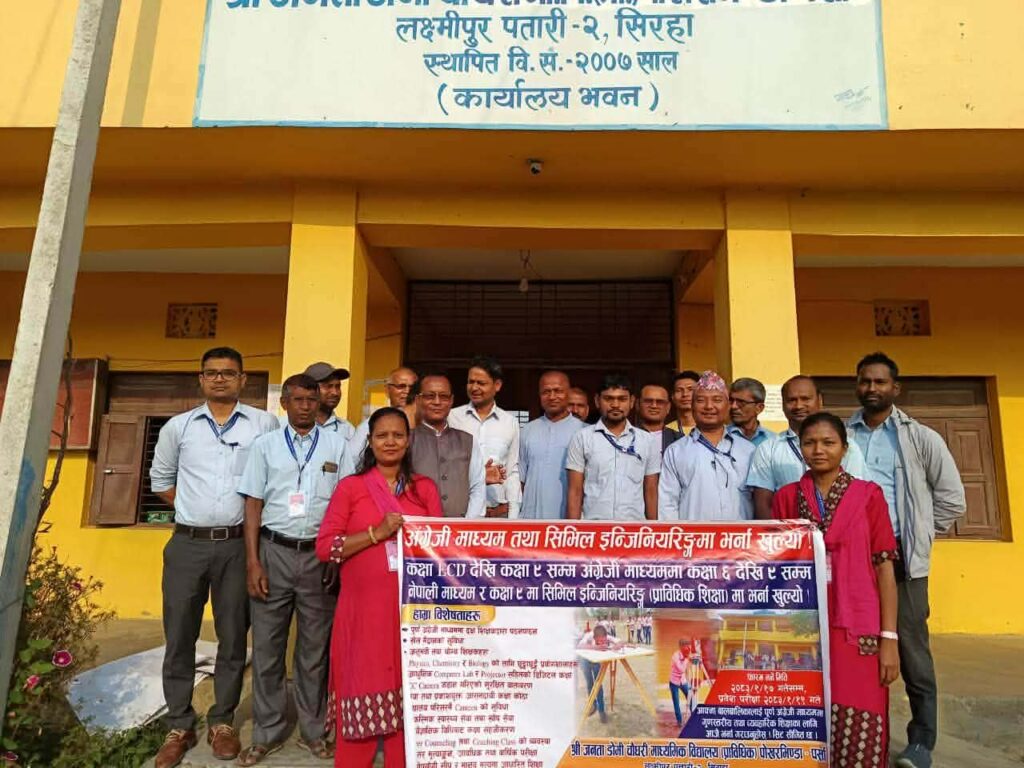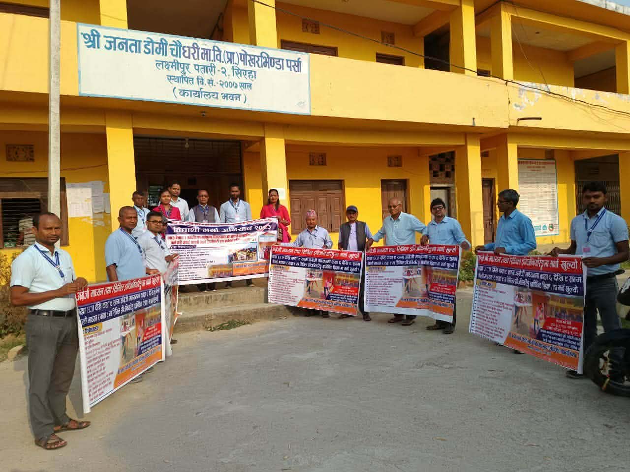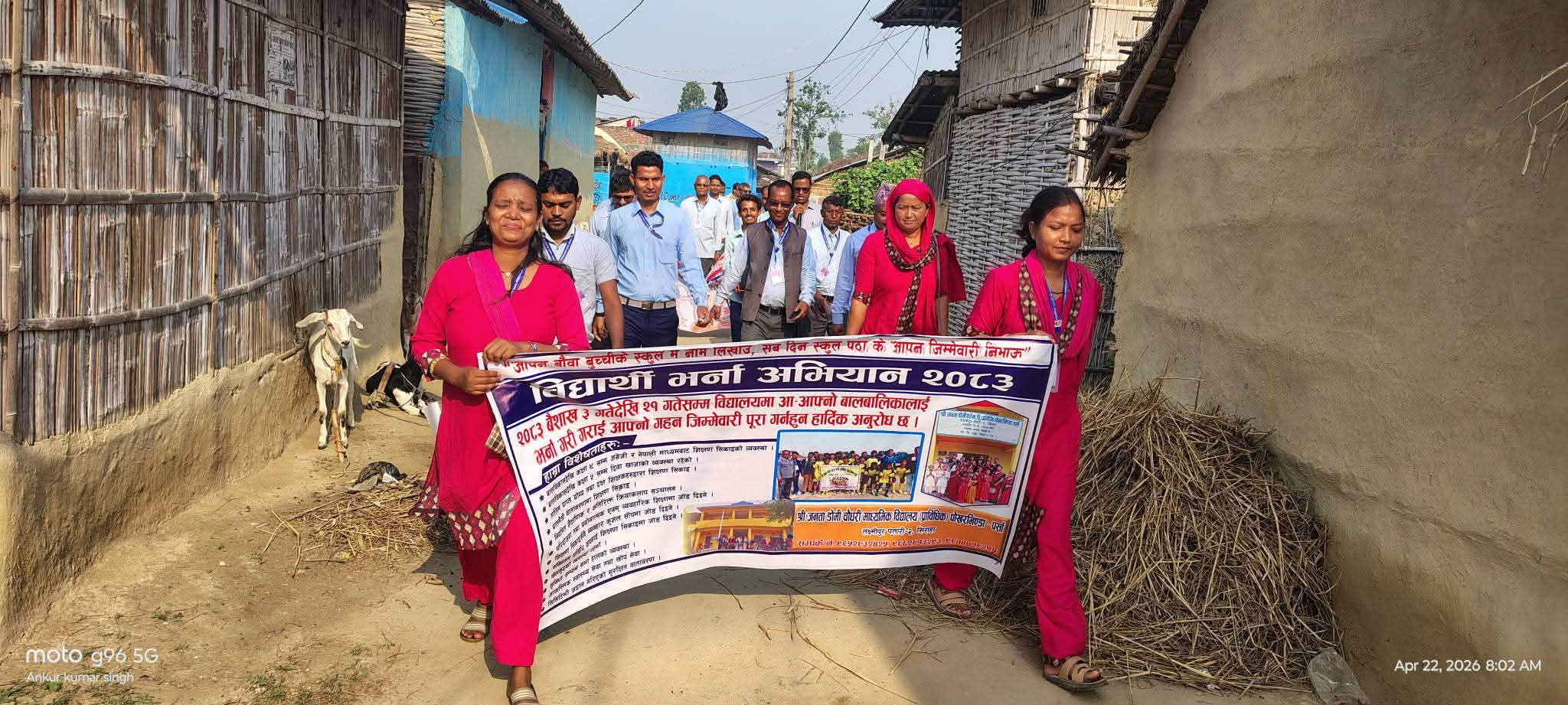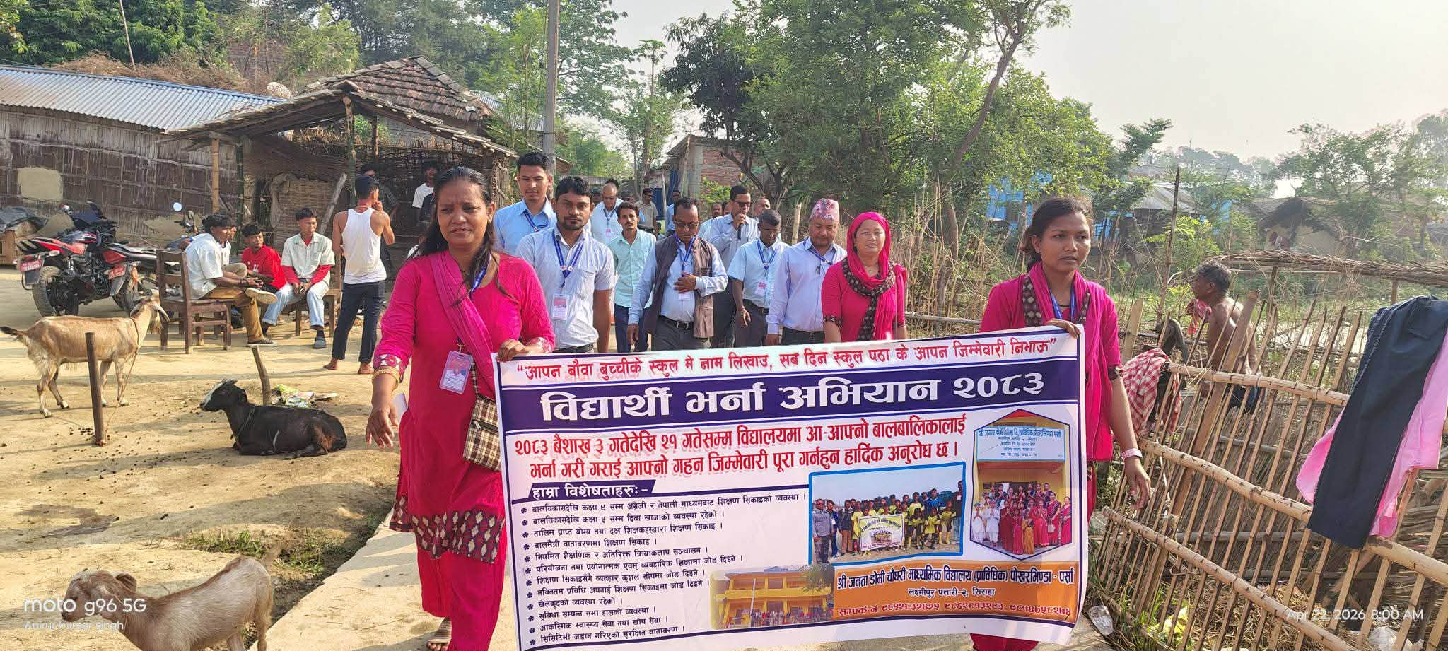 श्री जनता डोमी चौधरी मावि (प्राविधिक ) पोखरभिण्डा पर्सामा सञ्चालन गरिएको भर्ना अभियान २०८३ भव्य रूपमा सम्पन्न भएको छ। झण्डै ४० जना शिक्षक तथा कर्मचारीहरूको सक्रिय सहभागितामा सम्पन्न यस अभियानले समुदायमा शिक्षा सम्बन्धी जनचेतना अभिवृद्धि गर्न महत्वपूर्ण योगदान पुर्याएको छ।